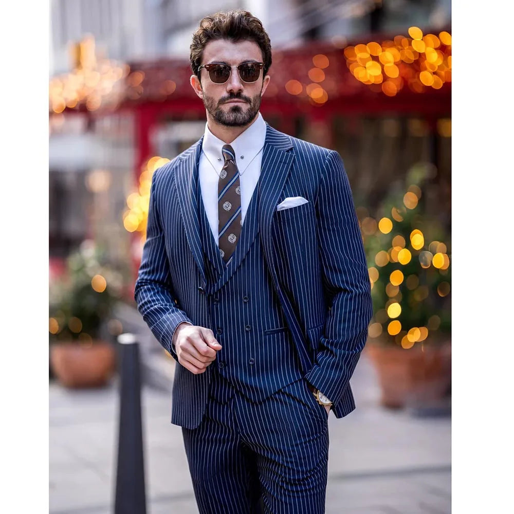 Homem elegantemente vestido com terno listrado, óculos de sol e gravata, representando como se vestir bem sem exageros