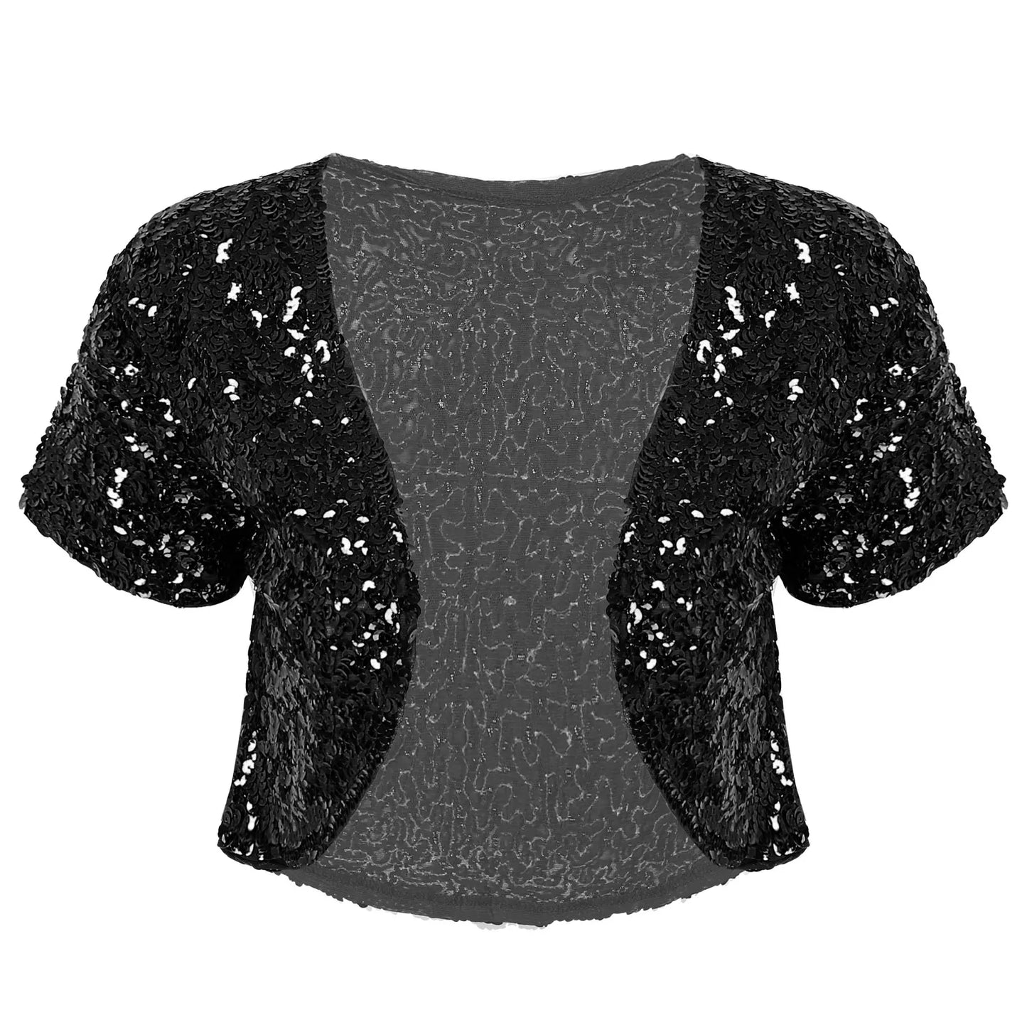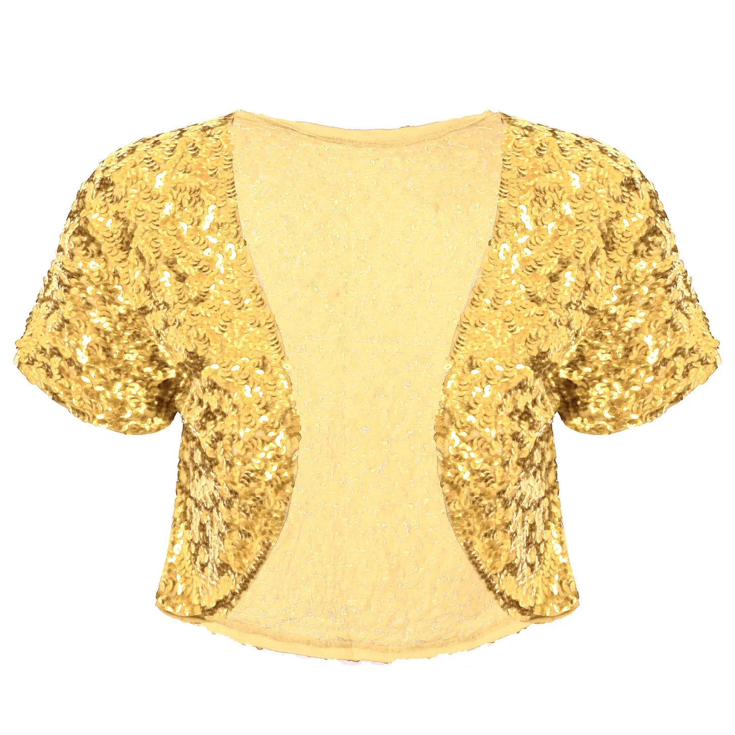 O cardigã brilhante apresenta manga curta, comprimento CROPPED, coberto com lantejoulas.
