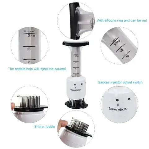 Descubra a praticidade do injetor de marinada 2 em 1, ideal para amantes da culinária que buscam sabor e maciez. Com design inovador, este injetor combina função de amaciar e temperar carnes. Inclui agulhas precisas para injetar marinadas profundas e distribuir sabores.