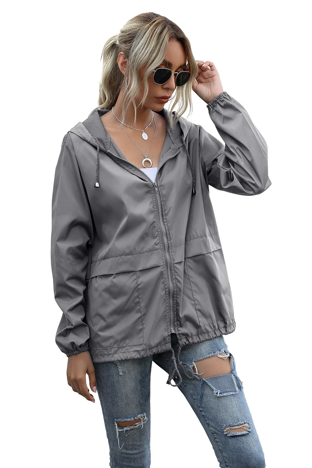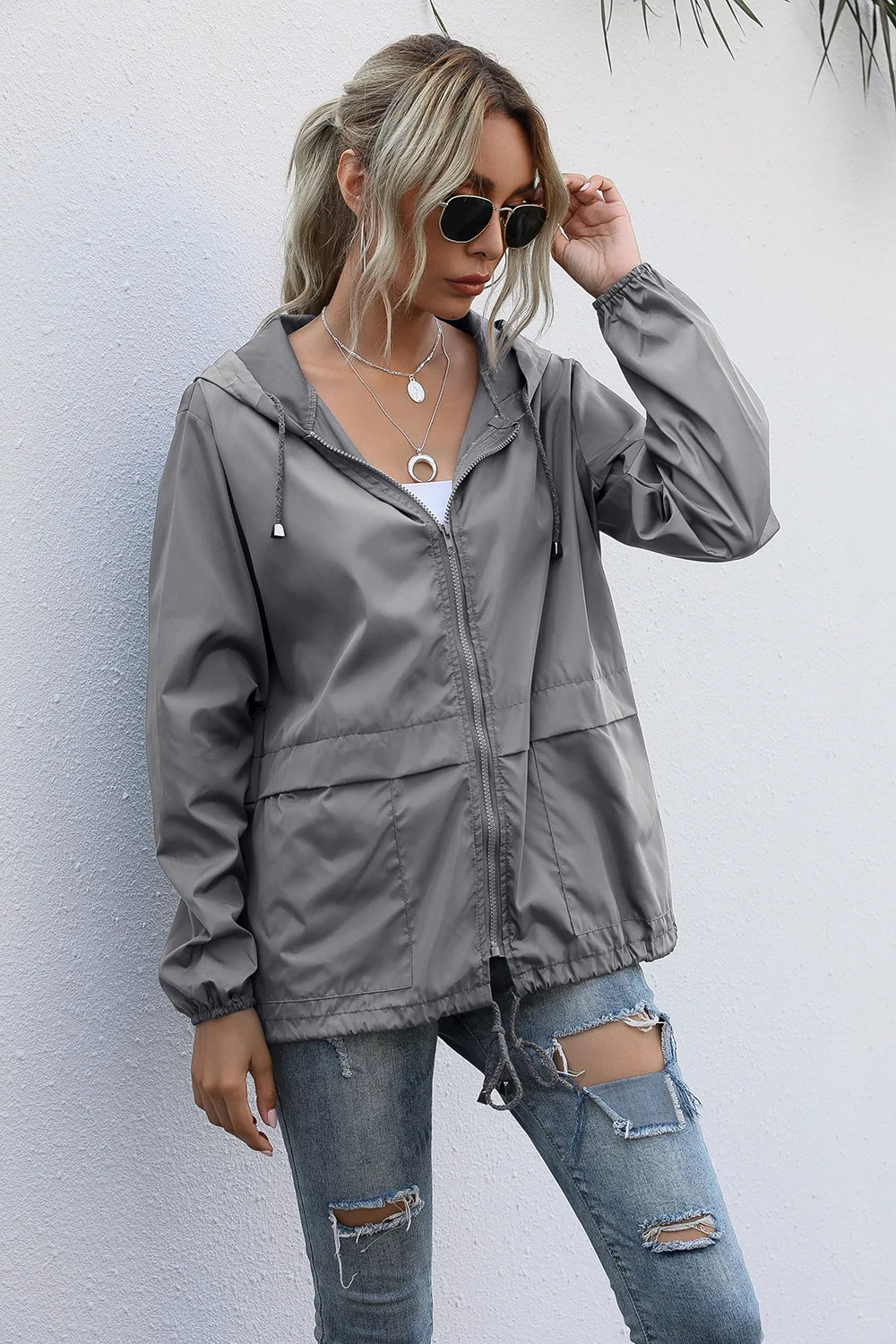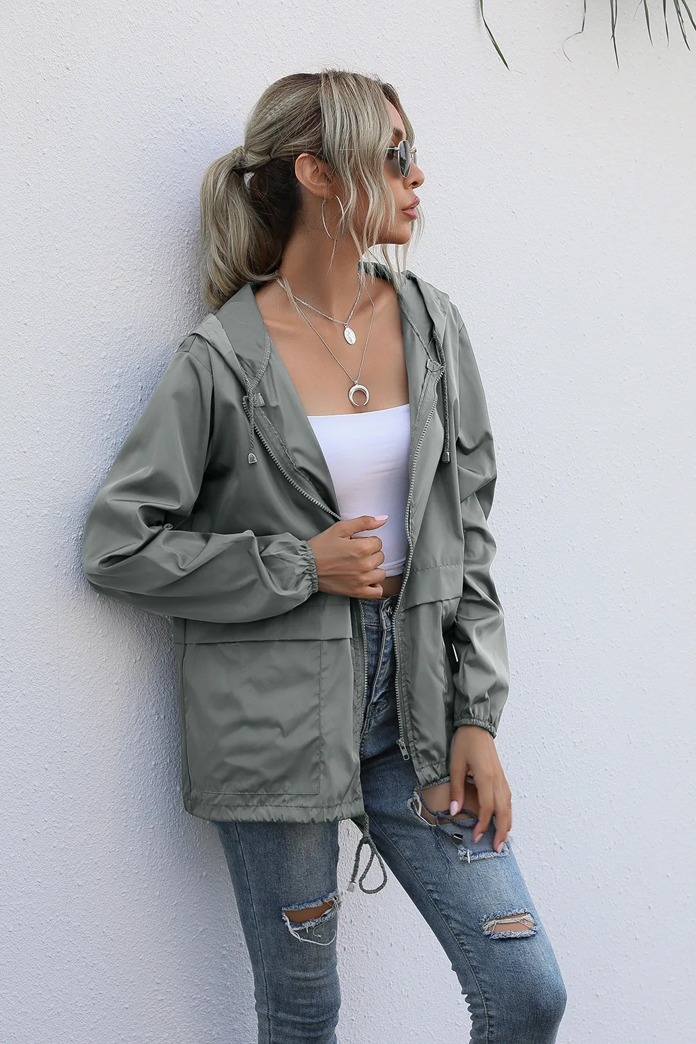 Jaqueta feminina, casual, solta, primavera/outono, zíper, moletom com capuz, capa de chuva leve, cor sólida