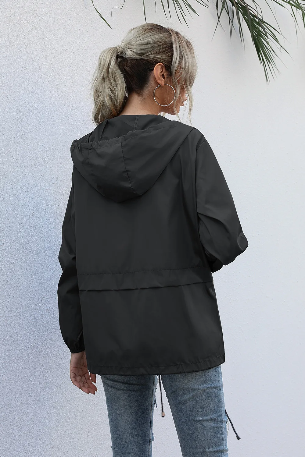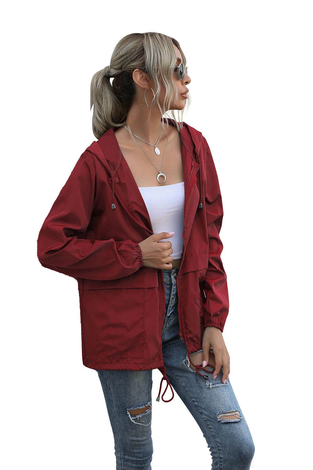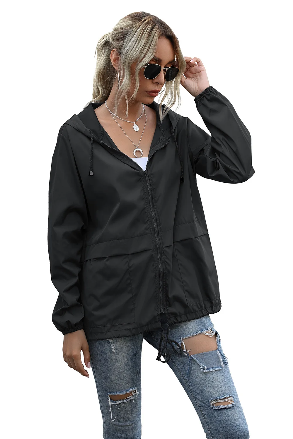Jaqueta feminina, casual, solta, primavera/outono, zíper, moletom com capuz, capa de chuva leve, cor sólida