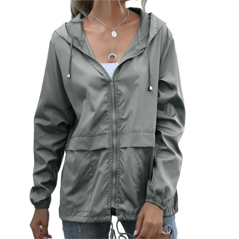 Jaqueta feminina casual solta, primavera/outono, zíper, moletom com capuz, capa de chuva leve, cor sólida