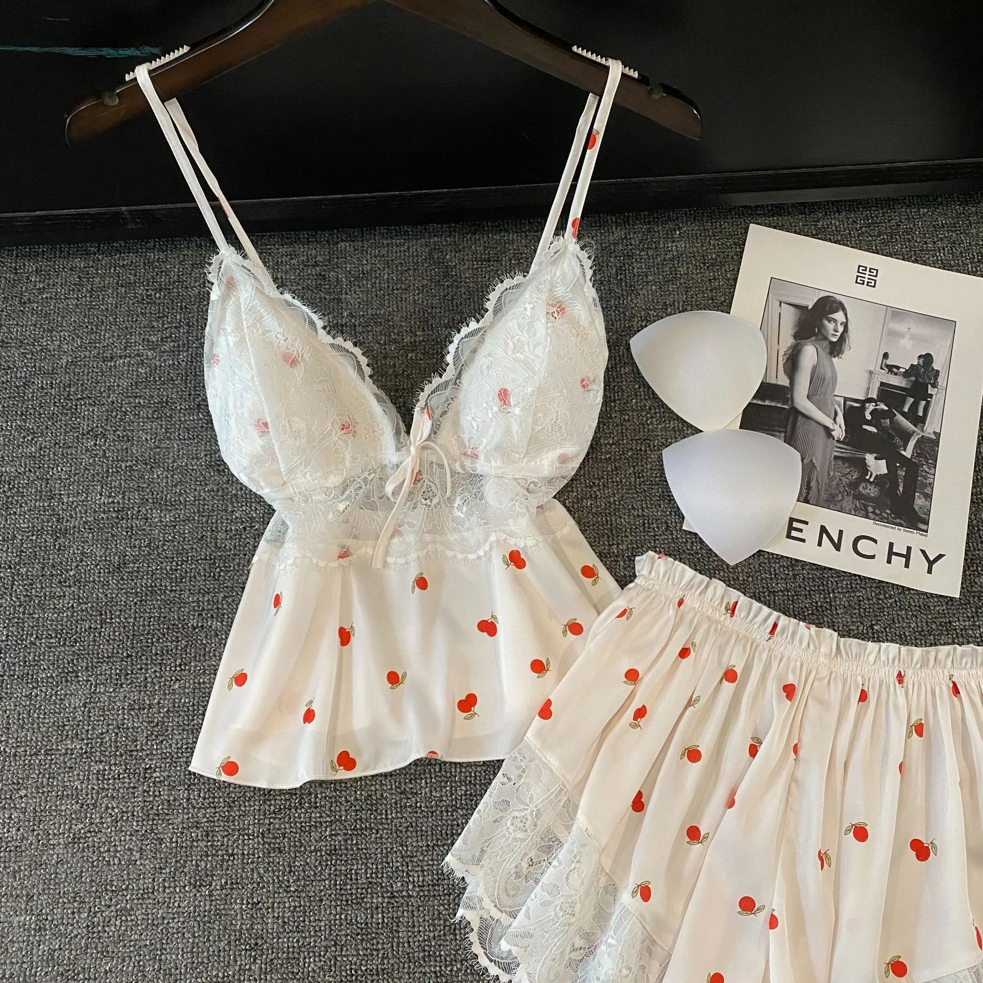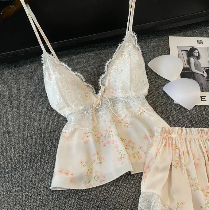 O top de alças finas e sem mangas, feito de cetim suave, é adornado com renda delicada, proporcionando um toque sensual. O shorts acompanha o design, garantindo um visual harmonioso. Este terno de cetim luxuoso oferece a leveza e frescor que você procura.
