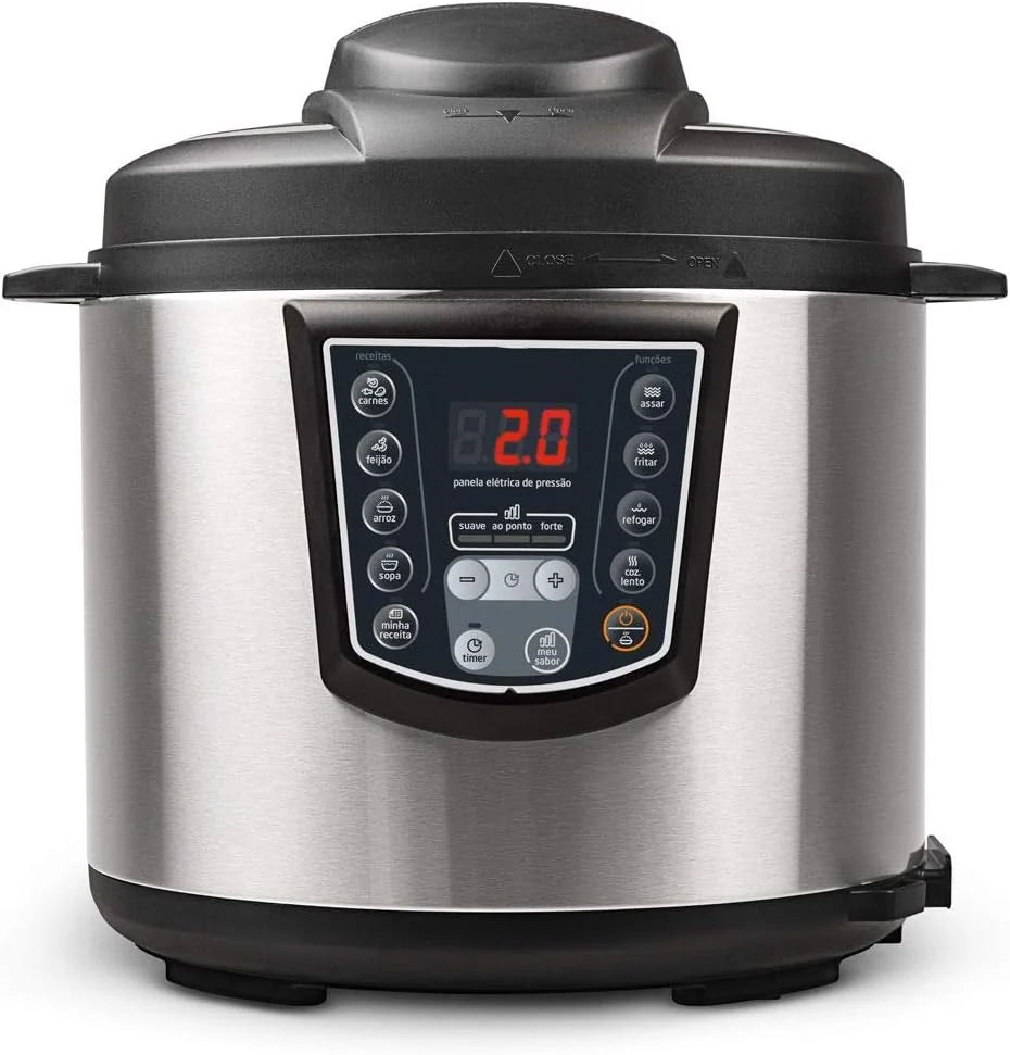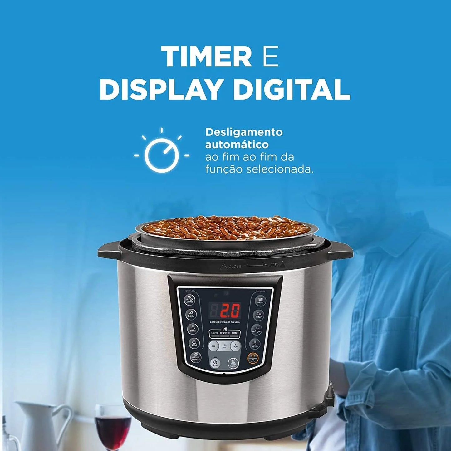 6l de capacidade com 6 receitas pré-programadas: a panela de pressão conta com 6 receitas pré-programadas oferecendo diversas possibilidades para seu dia a dia : cozinha, assa, frita, refoga, cozimento lento e manter aquecido