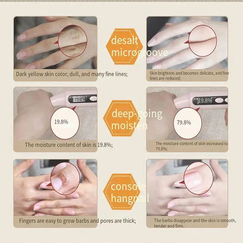 Pele, melhora a aspereza da mão e desbota as linhas finas. Aumente a umidade e o conforto da pele, deixando as mãos macias, suaves e radiantes.