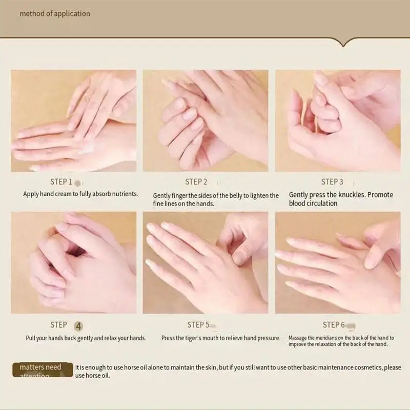 ▶ da embalagem Eficácia do produto: O óleo de cavalo pode criar uma camada protetora na superfície da pele, hidratando e hidratando as mãos
