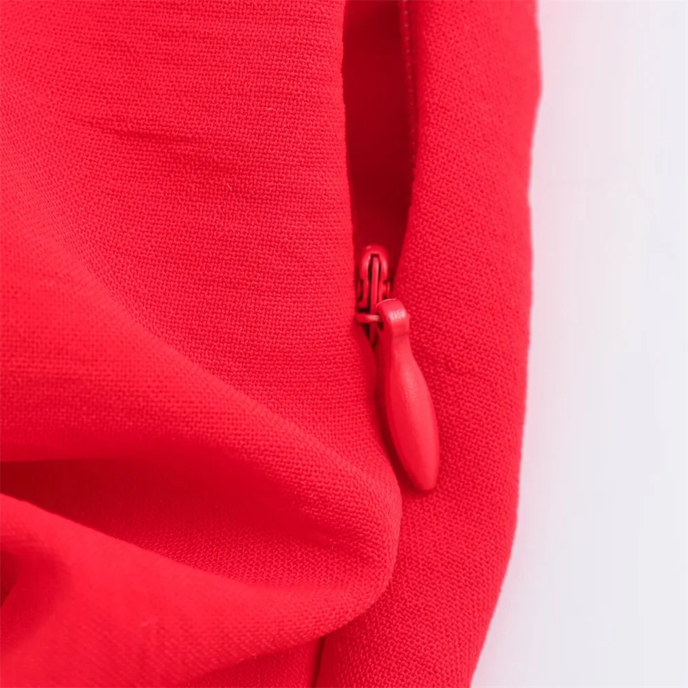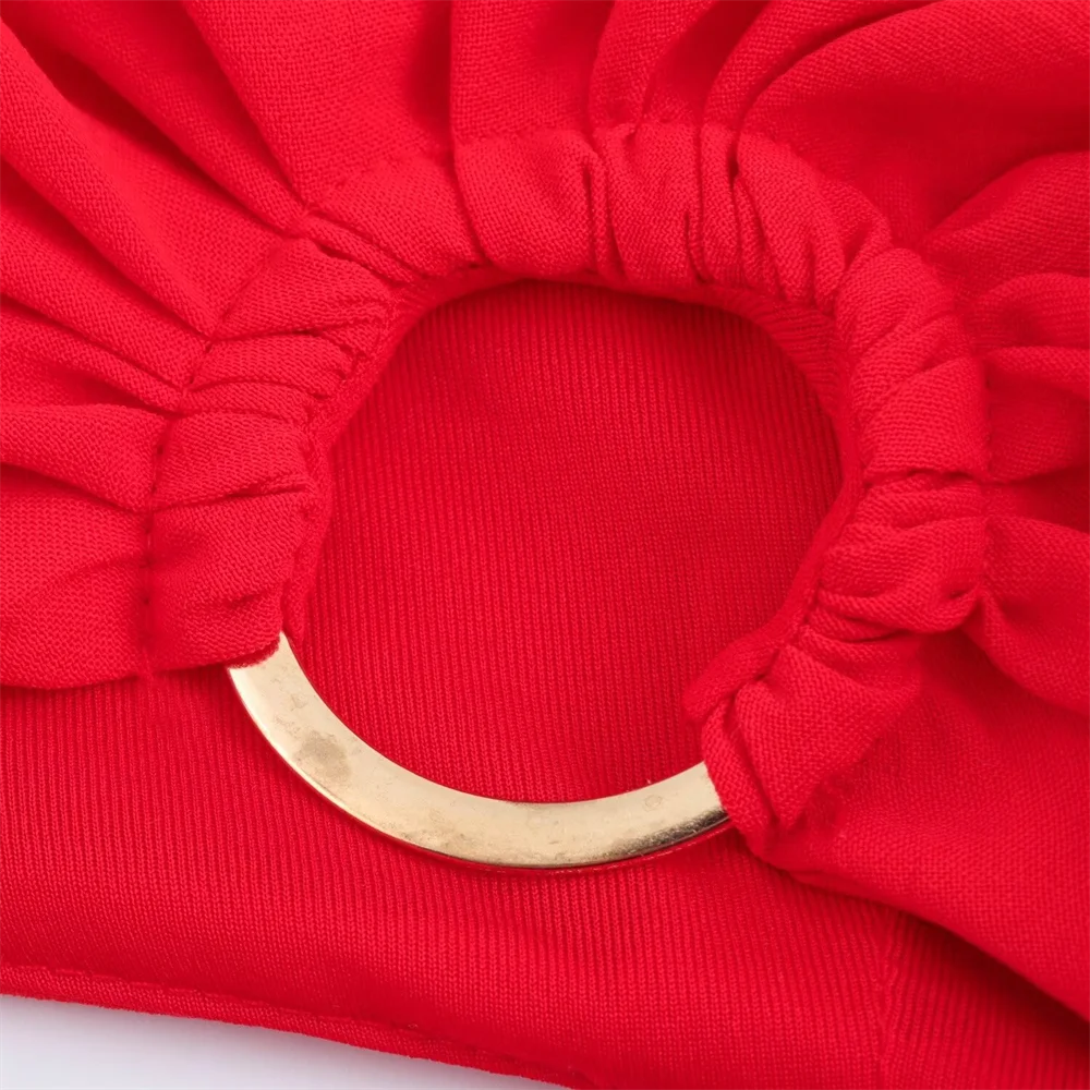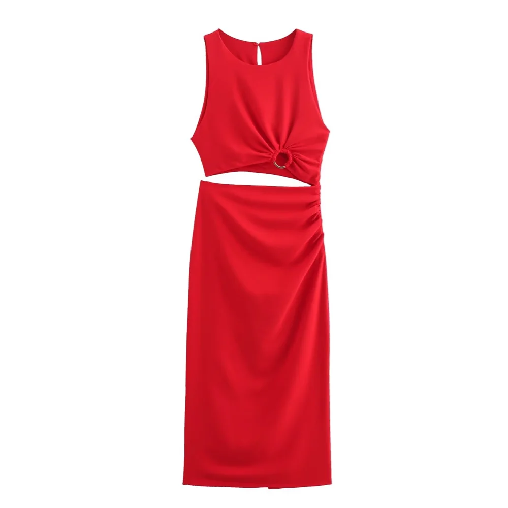 Com um design aberto, este vestido sem mangas destaca-se pela sua fivela de laço única. O corte elegante vestido slim fit valoriza a silhueta, oferecendo um ajuste perfeito que realça as suas curvas de maneira delicada.